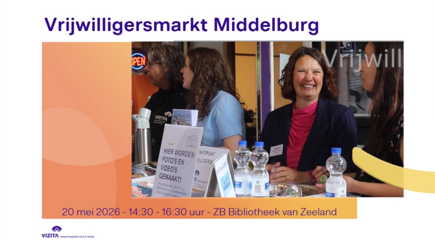 Op woensdag 20 mei 2026 organiseert Vizita een inspirerende Vrijwilligersmarkt in de ZB Bibliotheek van Zeeland. Tussen 14.30 en 16.30 uur zijn 20 vrijwilligersorganisaties aanwezig die graag vertellen over hun werk en de mogelijkheden om als vrijwilliger aan de slag te gaan.